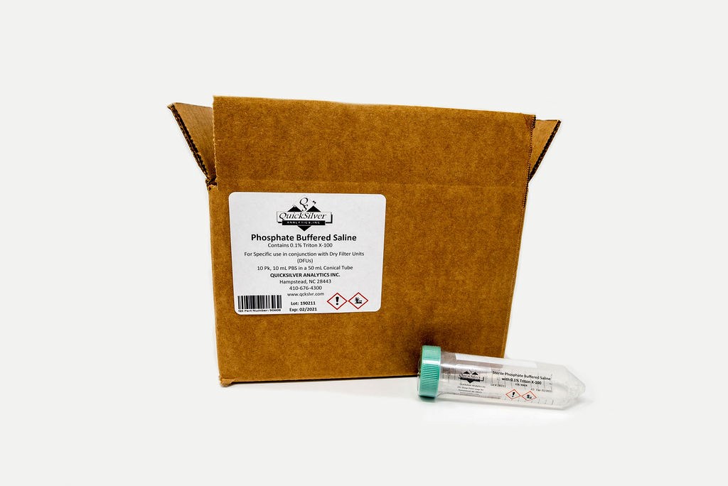 Key Features: Phosphate buffered saline (PBS) is a buffer solution commonly used in biological research. It is a water-based salt solution containing sodium phosphate, sodium chloride, potassium chloride and potassium phosphate. The osmolarity and ion concentrations of the solutions are isotonic. Because PBS is isotonic and non-toxic to most cells, it has many uses. For Specific use in conjunction with Dry Filter Units (DFUs): Following sampling, the DFU filters can be transported to the laboratory and manually suspended in our 50ml conical tubes containing 10ml phosphate-buffered saline (PBS) with 0.1% Triton X-100, pH 7.4. Samples can then be prepared for further analysis (i.e., DNA extraction, protein analysis, microbiological plating).
